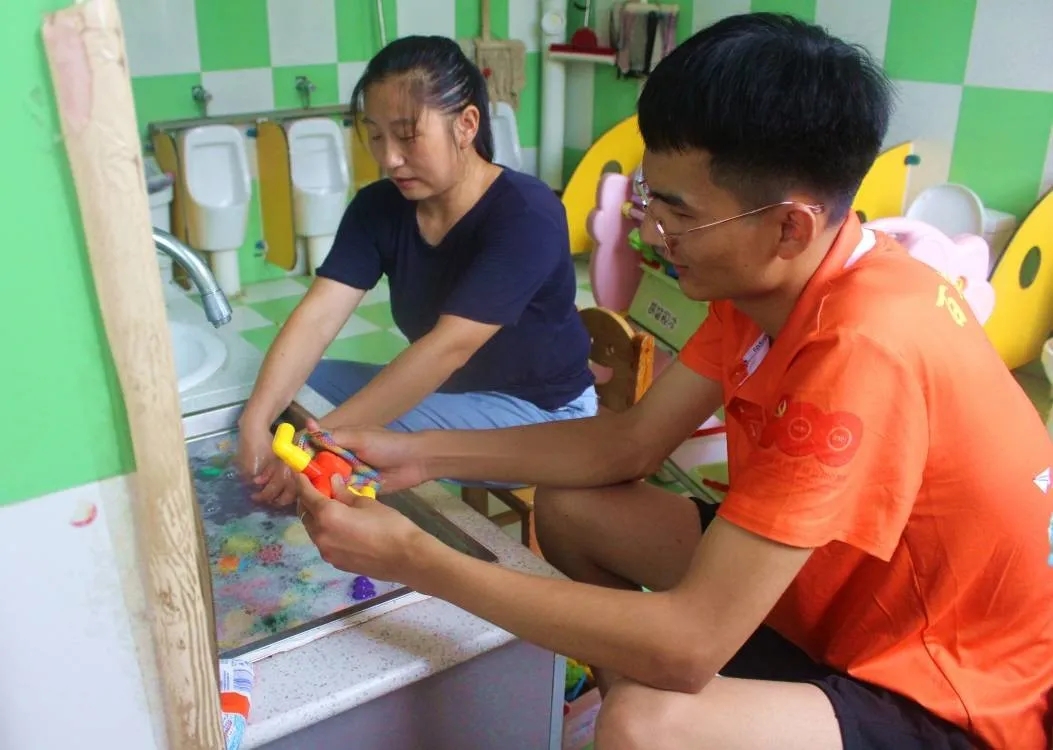 鹤山镇中心幼儿园的老师们与队员们一起进行了卫生大扫除,为幼儿们的到来做了充分的准备。