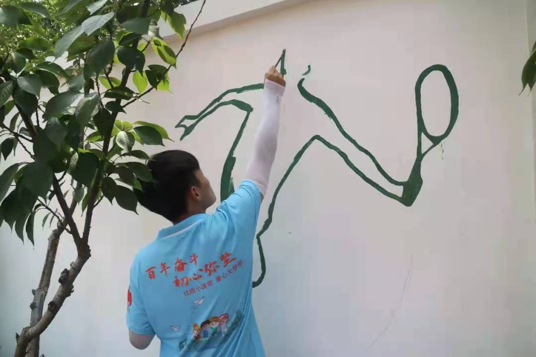 大雨过后,太阳又冒出来了,万里无云,烈日直射,气温又刷刷地升高了。蝉儿高一声低一声的鸣叫,似乎要把阳光炙烤的夏日变得更长。而画墙绘的志愿者们依然坚守在操场上……