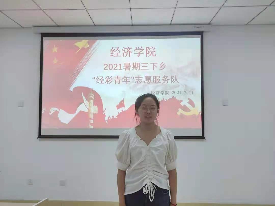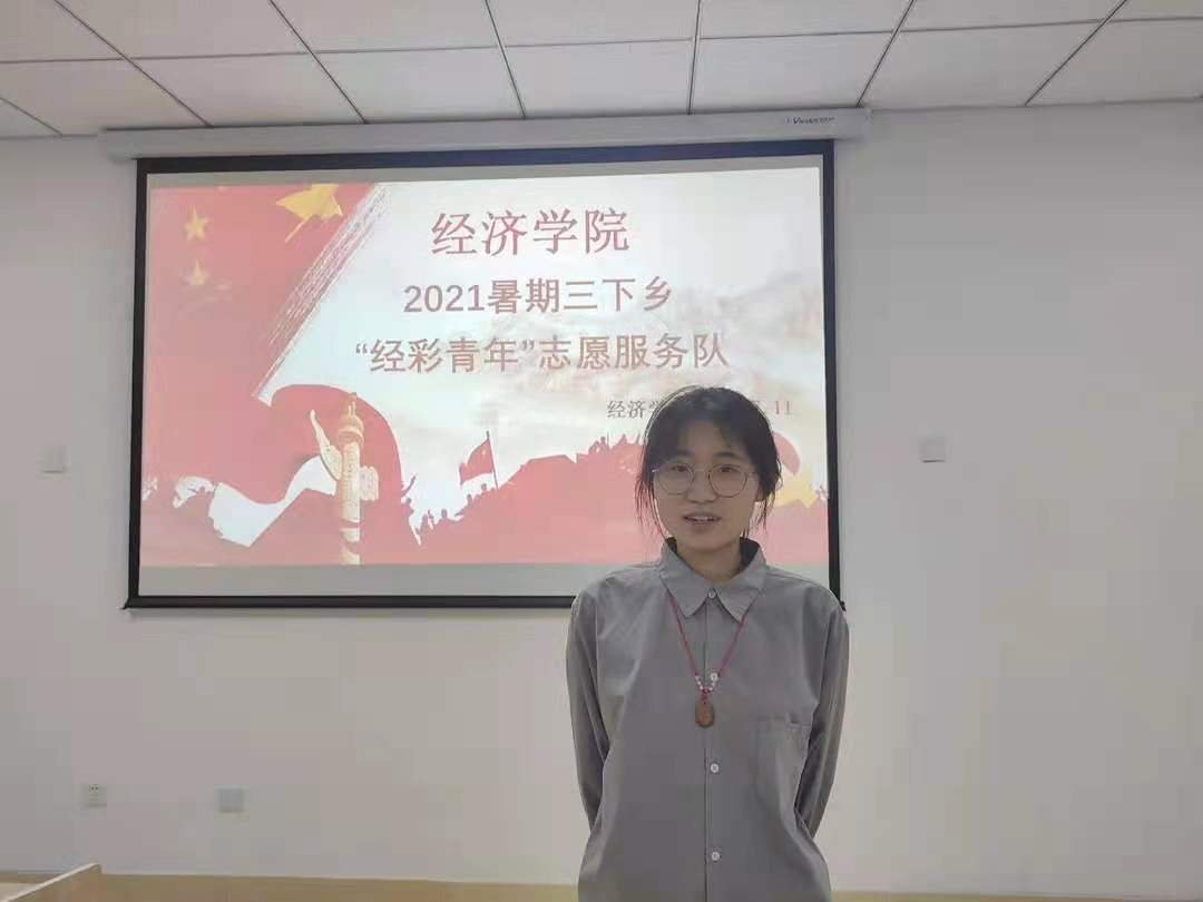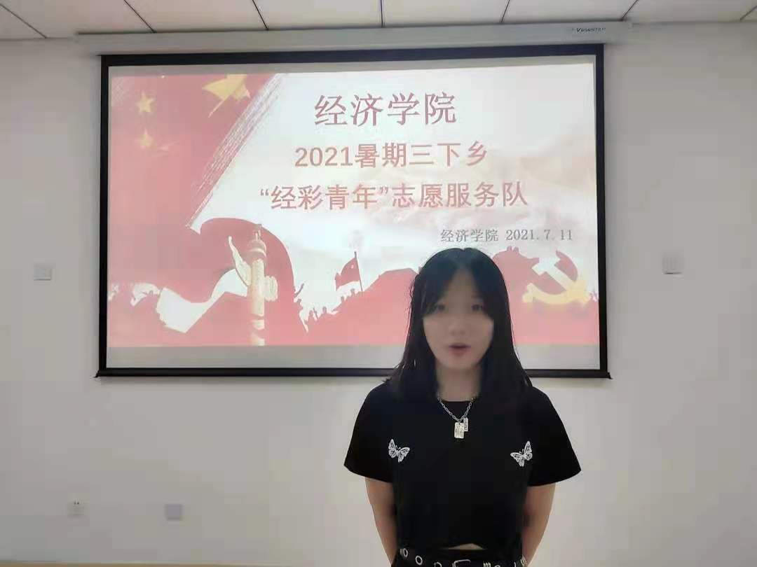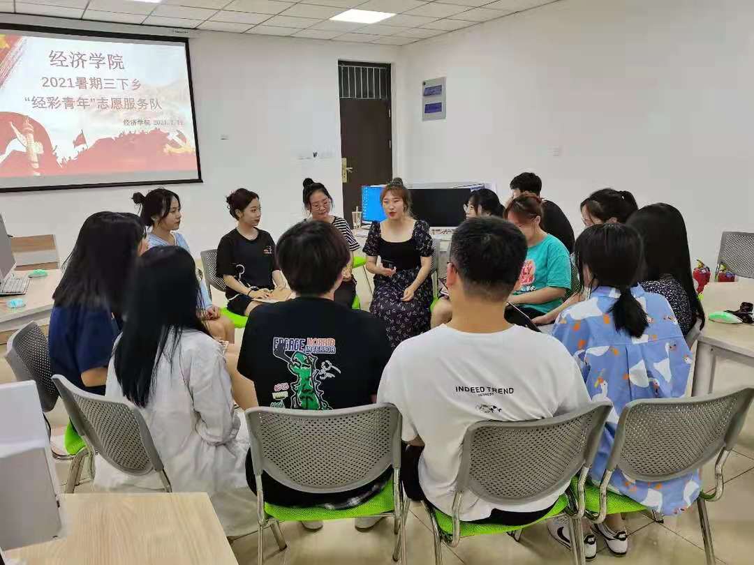在庆祝党的百年华诞和全国上下深入学习习近平总书记“七一”重要讲话精神的大背景下,为积极创新助农方式,以网络传播力拓展助农产品销售渠道,经济学院“经彩青年”志愿服务队于7月12日下午在求真楼202会议室,成功举办了以“青春‘播’种,经觅新机”为主题的2021三下乡社会实践启动仪式。党总支副书记赵晓琳、带队老师杨辰兴以及志愿服务队全体成员到场参会。