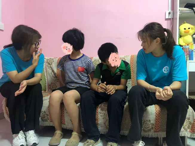 志愿者上前与孩子进行聊天互动,从孩子自己的兴趣聊起,循序渐进的询问孩子不来上课的原因。从陌生到熟悉,孩子逐渐展开心扉,说出自己的疑虑,志愿者一一为其解答,说到兴起时志愿者和孩子一同笑了起来,半天相处下来,志愿者为孩子提供了适合他们自身的建议,孩子也在志愿者的带领下重新回到了课堂,学习吸收有趣有益的课程。