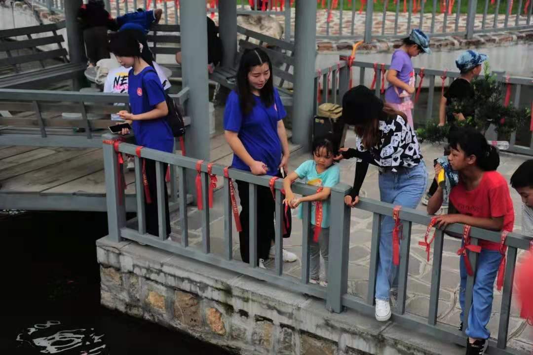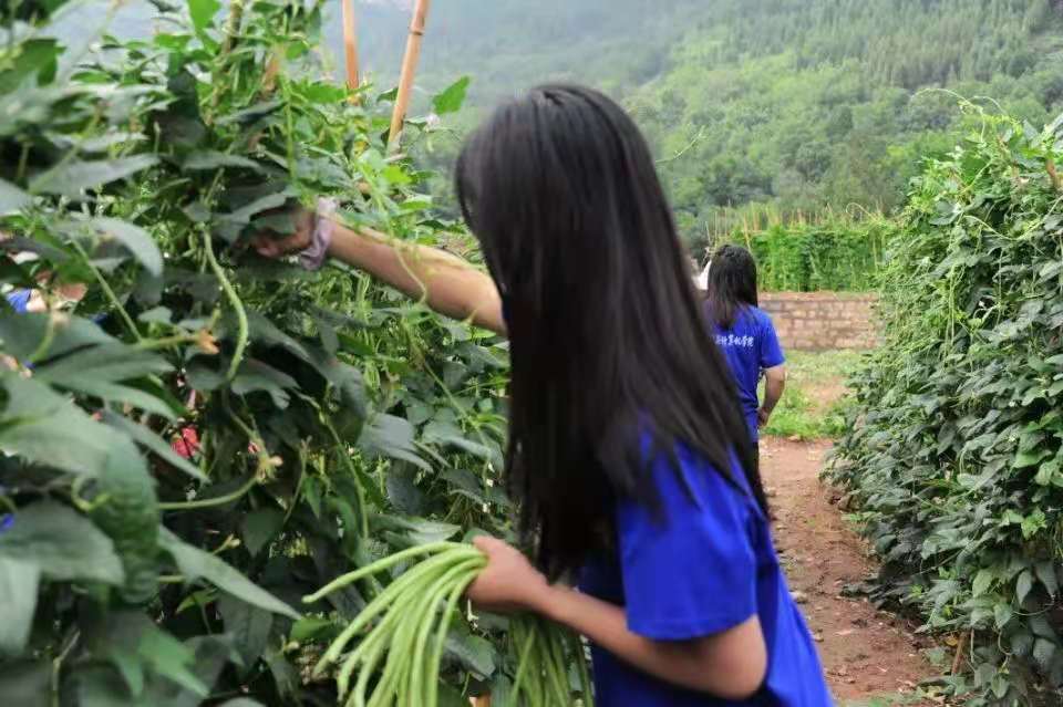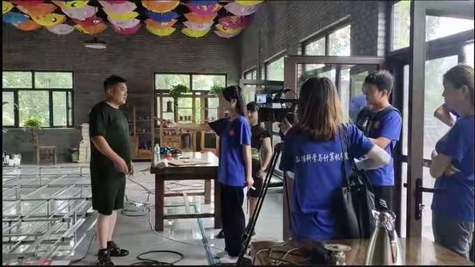 实践第五天,“E初心”乡村振兴服务队分成两队,一队再一次登上山顶,在途中对山中景区佛眼、爱情天梯、吊桥、玻璃栈道,空中云梯等进行拍摄;另一队分别对采摘园、檀抱泉进行补拍,并帮助农忙的阿姨采摘豆角、扁豆等新鲜食材,在檀抱泉恰巧遇到正在夏令营的小朋友,服务队看到他们踩在围栏上投喂鱼食,随即在教练的允许下,对小朋友们展开防溺水安全教育。随后两队汇合,对村支部书记、副书记进行了采访,并驱车前往灵岩村对村容村貌进行了拍摄。虽然汗水浸花了妆,也浸透了衣衫,但并没有阻挡乡村振兴服务队前行的脚步。