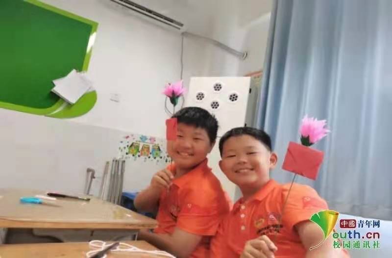 图为孩子们展示康乃馨褶皱纸作品。