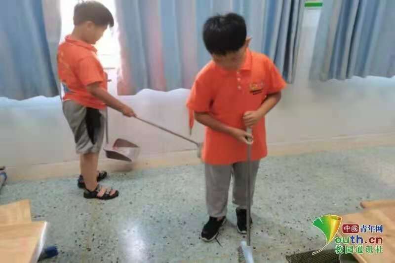 图为孩子们自觉的拿起卫生工具打扫整理手工课的垃圾。