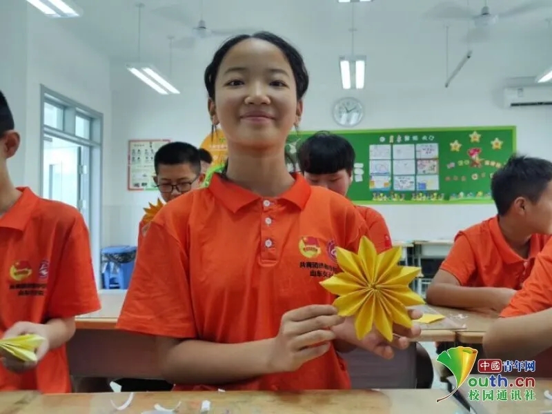 图为一位小朋友正在给志愿者展示自己正在制作中的“向日葵”,虽然花还没有完成,但是已经看到了小朋友们对父母的爱。这位小朋友制作很仔细。