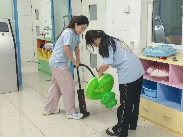 团队在福利院开展了特色康复活动。队员们在水疗室准备了安全材质的彩色卡通气球,设计“捞气球”“气球接力”等环节,利用水的浮力和气球的感官刺激,辅助孩子进行康复训练,像肢体运动障碍的小宇就在引导下取得进步。同时,队员们在康复训练区辅助儿童做肢体训练,提前学习辅助技巧并规范操作,关注孩子反应,在专业辅助中传递温暖,让康复更具趣味性和有效性。