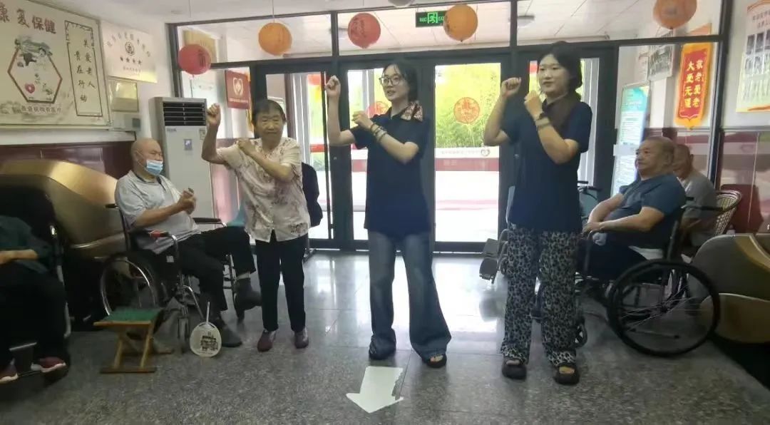 团队成员们把复杂的手势舞编成易学的舞蹈,跟着节奏教给老人们。从抬手、摆手、到指尖轻转动,老人们起初有些腼腆,随着活动的深入,老人们慢慢舒展肢体,眼神里渐渐有了笑意,还会跟着旋律轻轻哼唱。对老人们来说,这不仅是一次新奇的“舞蹈体验”,更是被陪伴的温暖,在学生们的耐心的指导、轻快的互动下,让医养公寓里多了欢声笑语。指尖舞动间,是青春与岁月的对话,更是爱与陪伴的传递。这场特别的“手势舞之约”,让“快乐”不分年龄,让温暖直抵心间。