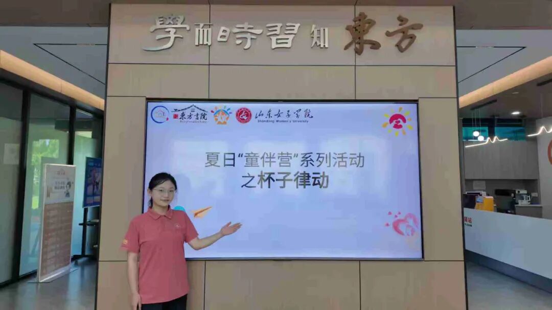 7月28日,工商管理学院暖心向YOUNG志愿服务队在淄博市张店区体育场街道东方社区,为35名幼儿园儿童带来“夏日童伴营”第二堂公益课——杯子律动。