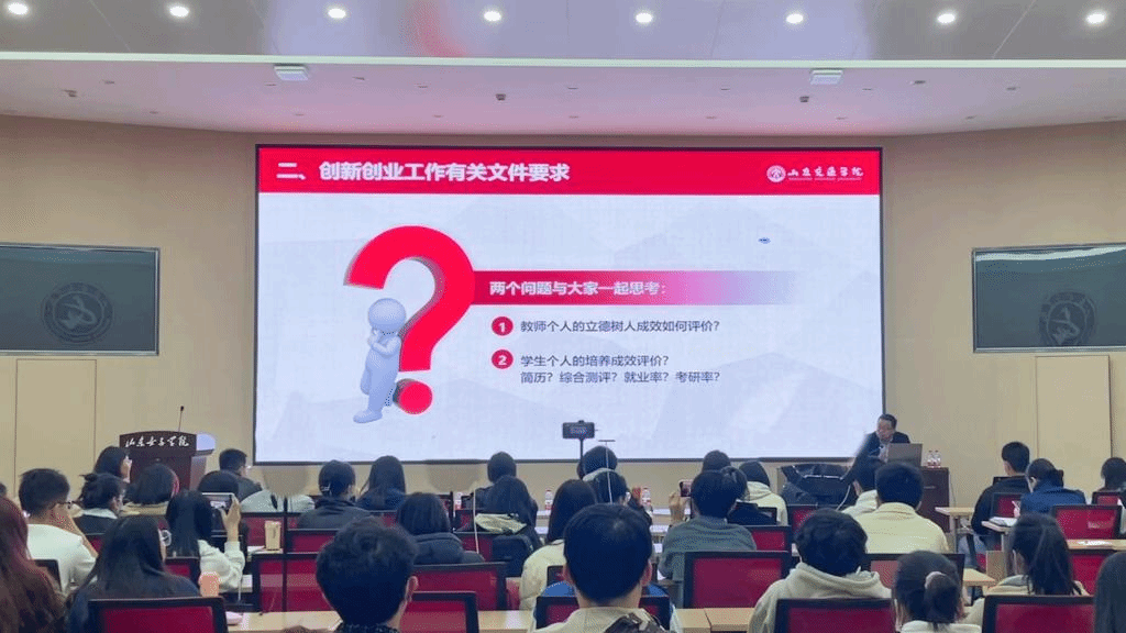 讲座开篇,吴硕抛出“教师立德树人成效应如何评价?”“学生人才培养成效如何评价?”两个问题,引发在座师生思考。他从创新创业有关文件要求、“挑战杯”竞赛情况介绍、做好大赛的几点思考等方面层层展开,以山东交通学院工作情况、兄弟高校获奖案例等丰富详实的资料为依托,详细分析了如何推进创新创业项目教育、科技、人才“一体三翼”发展,强调了“挑战杯”赛事对学校建设发展、一流学科申报、教师个人发展、学生综合成长等方面不可估量的重要作用。整场讲座内容高度凝练又内涵深邃,从政策支撑、赛前准备、项目书撰写、团队构成、ppt制作、指导教师价值发挥等方面,对赛事进行了全方位的解读,在场师生收获满满。
