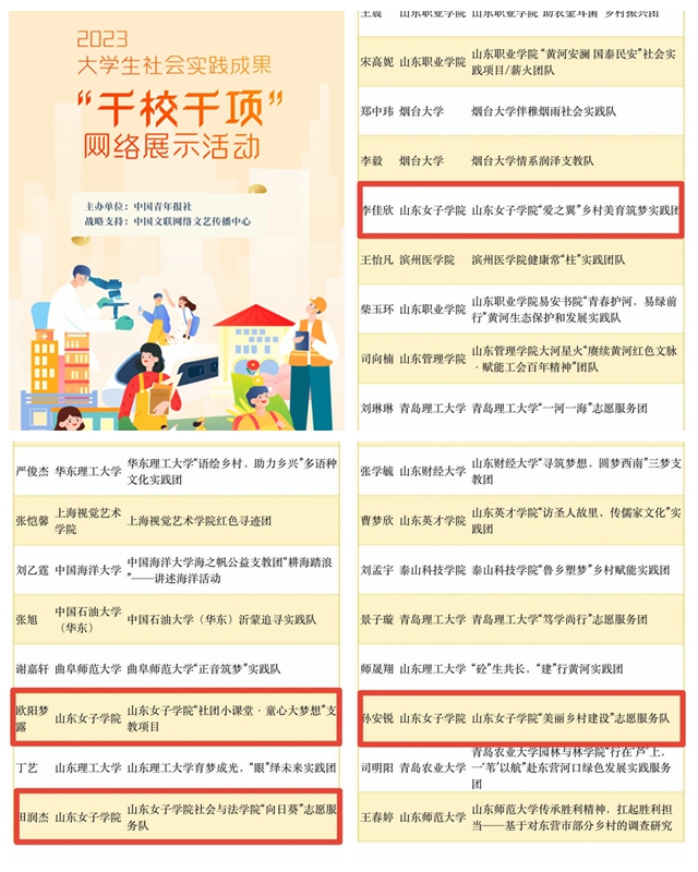 近日,由团中央指导、中国青年报社主办的2023年大学生社会实践成果“千校千项”网络展示活动评选结果公示,学校6支团队获奖,获奖团队数位居全省高校前列。其中,“爱之翼”乡村美育筑梦实践团、“社团小课堂·童心大梦想”支教团、“向日葵”志愿服务队、“美丽乡村建设”志愿服务队获得优秀项目奖,“萤火荣光”志愿服务队和“向阳为老,暖风抚幼”服务队获得优秀视频奖。