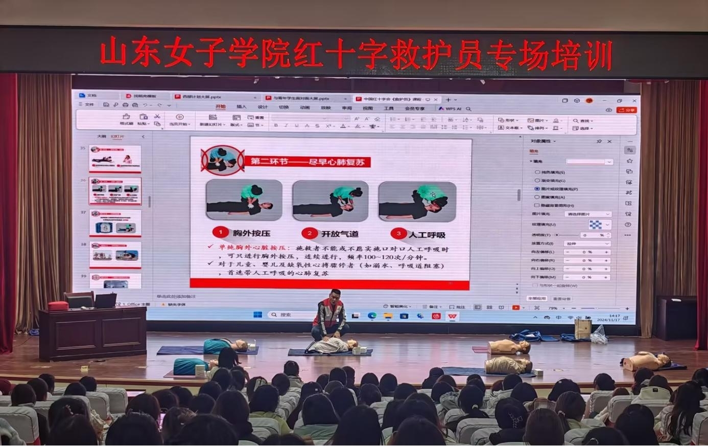 培训采用理论培训和实操演练相结合的方式,从师生需求出发,创新工作方法,组织多场次小班化“点单式”培训及2场报告厅大规模培训。培训现场,济南市红十字会讲师和助教通过情景式教学、现场教具演示、案例分析等,详细讲解心肺复苏、气道异物梗阻处理、AED使用、创伤救护等急救知识技能。现场演示环节,讲师结合模拟人、AED等设备为学员们进行了现场实操示范。