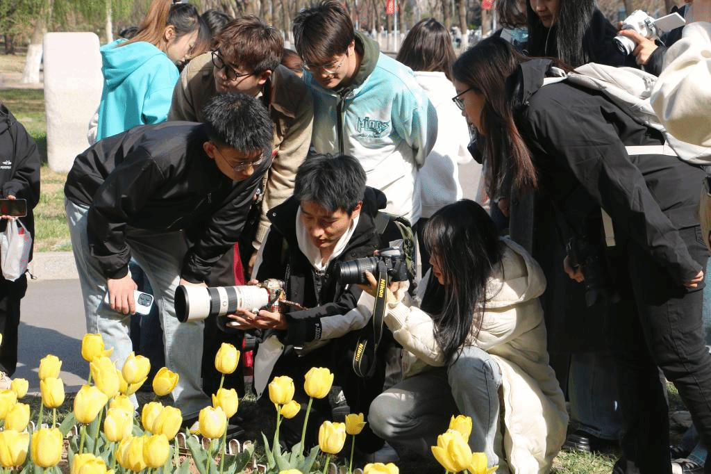 毕胜以“花花世界 这样看”为主题,从拍摄视角、构图方式、创意与故事三方面进行分享,详细讲解摄影的运用场景,建构画面的方式。在拍摄视角上,他建议同学们大胆尝试俯拍、仰拍、低角度拍摄等不同视角,以此让画面更具冲击力和干净度。构图方面,要秉持减法原则,通过变换角度去除多余元素,让主体更加鲜明。此外,他还强调创意与故事在摄影中的重要性,通过画面可营造故事感,引发观众的想象。同学们积极互动,分享自己拍摄的照片,毕胜从构图、色彩、主题表达等多个方面给出了意见建议。随后,毕胜带领同学们在校园开展实践教学,从郁金香花丛到西府海棠再到古白梨,从清照路再到静心湖,他一边示范,一边耐心讲解。