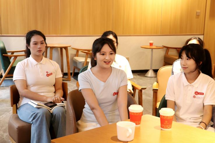 青年学生与吕晓黎围坐一起,围绕《习近平讲故事》书中关于文化自信和社会发展篇章畅谈读书体会,教育学院巾帼班史泽遥同学表示文化自信是在潜移默化中产生的,她谈到了自己家乡的文化和教育家精神,并立志成为一名教师,在孩子们心中种下文化自信的种子;社会发展学院维吾尔族热米拉同学分享到,在校园里虽然大家民族不同、文化背景各异,但彼此尊重包容,相互帮助,就像石榴籽一样紧紧抱在一起;数据科学与计算机学院田鑫同学结合自己参加学科竞赛的经历,讲述用现代技术实现文物修复的过程,感受到AI技术与传统文化融合的巨大潜力。大家踊跃发言,现场气氛热烈,每位到场同学都结合自己成长经历、学习生活、科创实践等进行了分享。