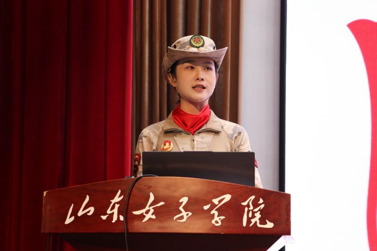 首先济南市公安局李雪以“以热血青春 铸傲骨铿锵”为题,讲述在今年9月3日纪念中国人民抗日战争暨世界反法西斯战争胜利80周年大会上,作为民兵方队的一员训练的经历。为了以最佳状态亮相,她经历了7个月的训练,穿坏了5双作战靴,原本不到120斤的体重减重20斤。她说“虽然训练时磨破了脚、划伤了肩膀,但想想抗战先辈的牺牲,我们这点付出不值一提。”李雪的坚定信念点燃了在场同学们的热情,现场气氛热烈。