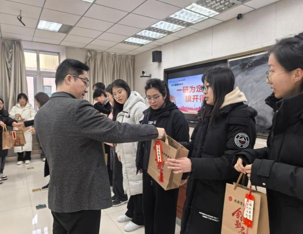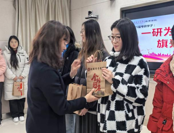 教育学院领导向考研学生代表赠送了寓意美好的“金榜题名”礼包。礼包内含实用文具套装、营养牛奶及巧克力,祝愿同学们考试时精力充沛,文思泉涌,巧克难关,笔下生花,最终旗开得胜,金榜题名。