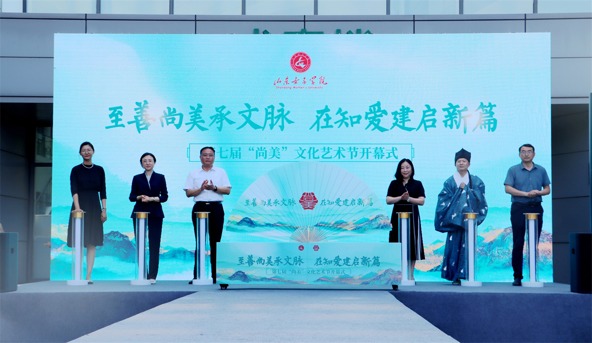 龙希利与在场嘉宾、学校部门负责人共同揭幕艺术节标志,启动第七届文化艺术节。标志设计以篆体汉字“尚美”的字体变形为主要图形元素,结合花形背景和“女院红”标准色,形似振翅的蝴蝶,体现中华优秀传统文化元素与现代女院的结合。