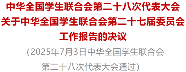 中华全国学生联合会第二十八次代表大会听取和审议了徐辉同学代表全国学联第二十七届委员会所作的工作报告。报告坚持以习近平新时代中国特色社会主义思想为指导,全面总结了在以习近平同志为核心的党中央坚强领导下学联学生会过去五年的工作,阐述了习近平总书记对新时代青年学生的重要要求,明确了新时代新征程学联学生会工作的根本遵循,谋划了未来五年学联学生会的工作方向和重点任务,提出了学联学生会未来一个时期深化改革的思路和举措。大会决定批准这一报告。